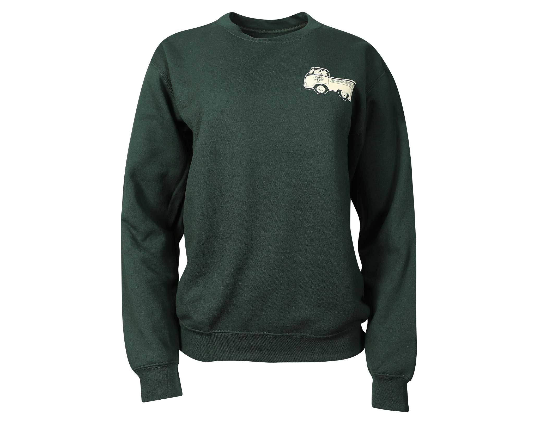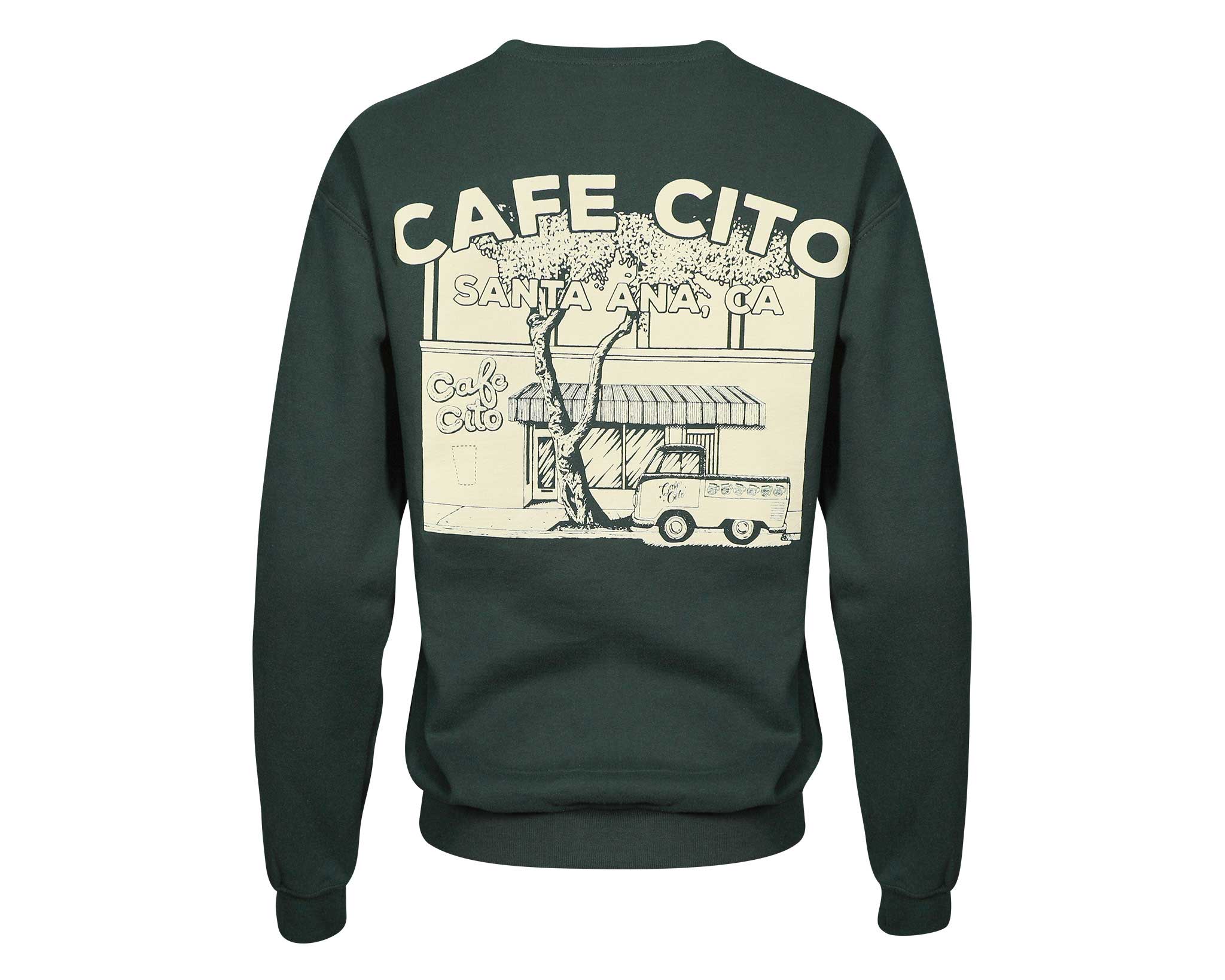 Stay cozy with the Kombi Crewneck, featuring a graphic of our Santa Ana storefront and classic truck on a premium forest green pullover. This sweatshirt is the perfect layer for those early morning coffee runs.