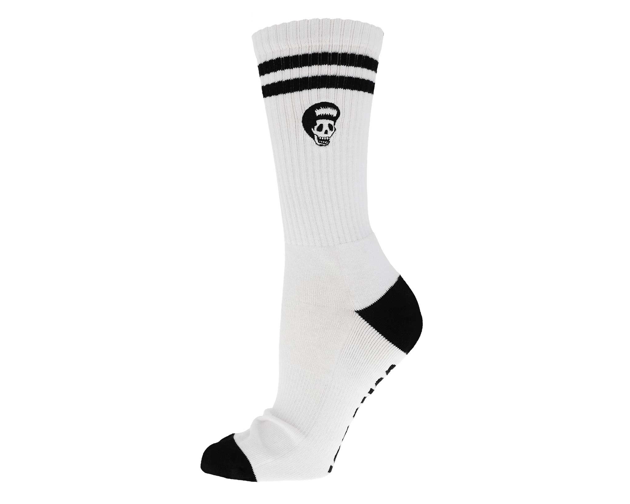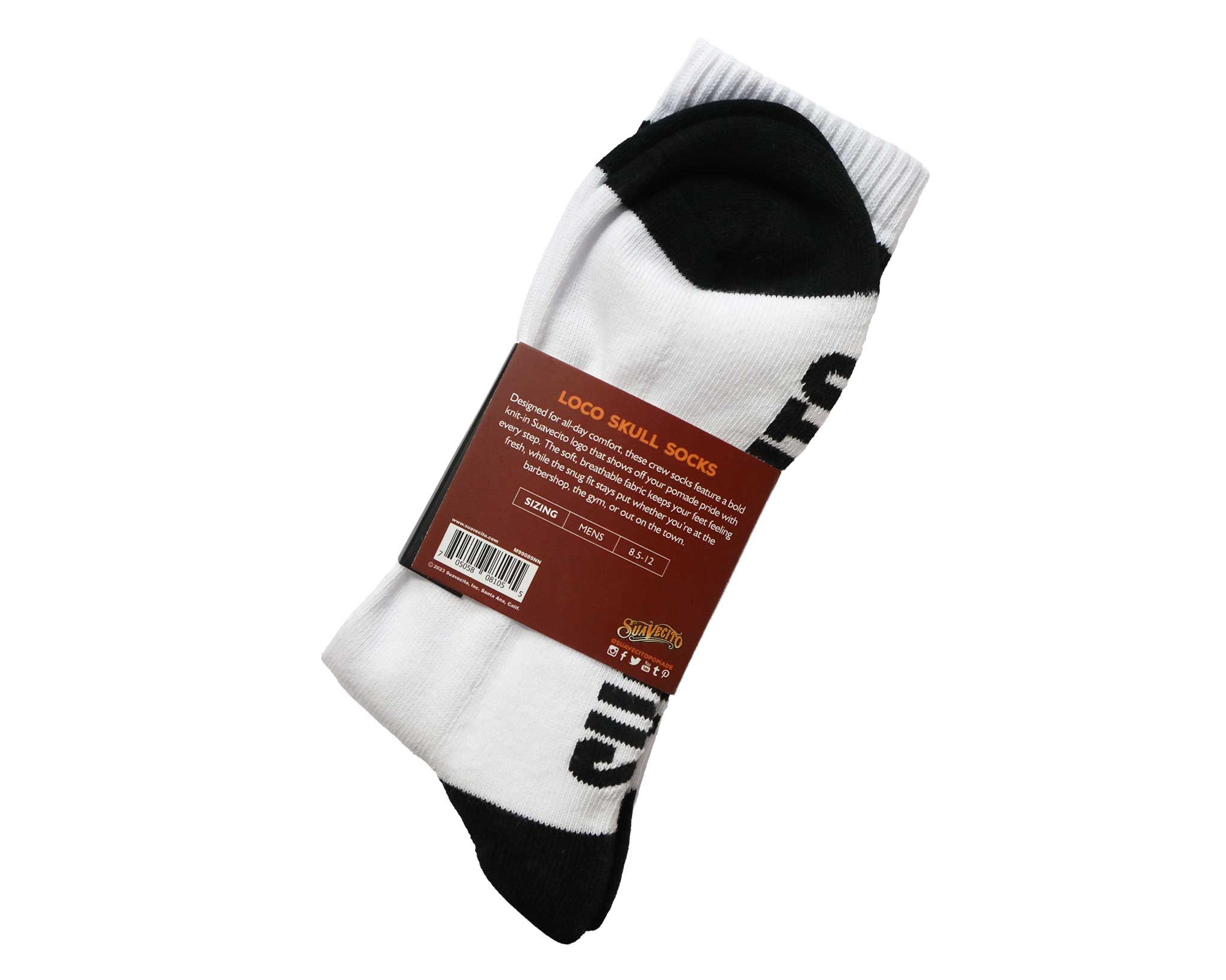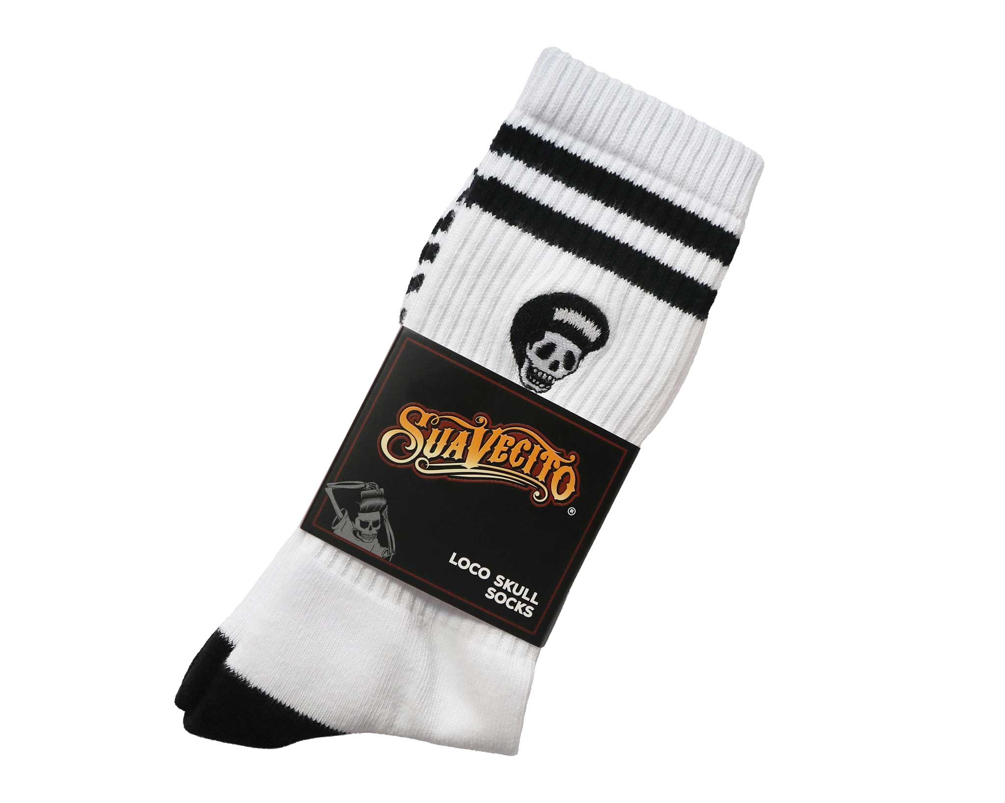 Keep your style on point with the Loco Skull Socks, featuring a classic white crew design accented by sharp black stripes and a skull graphic. These athletic-style socks are finished with bold "Suavecito" lettering on the soles, blending comfort with a clean, rebellious edge.