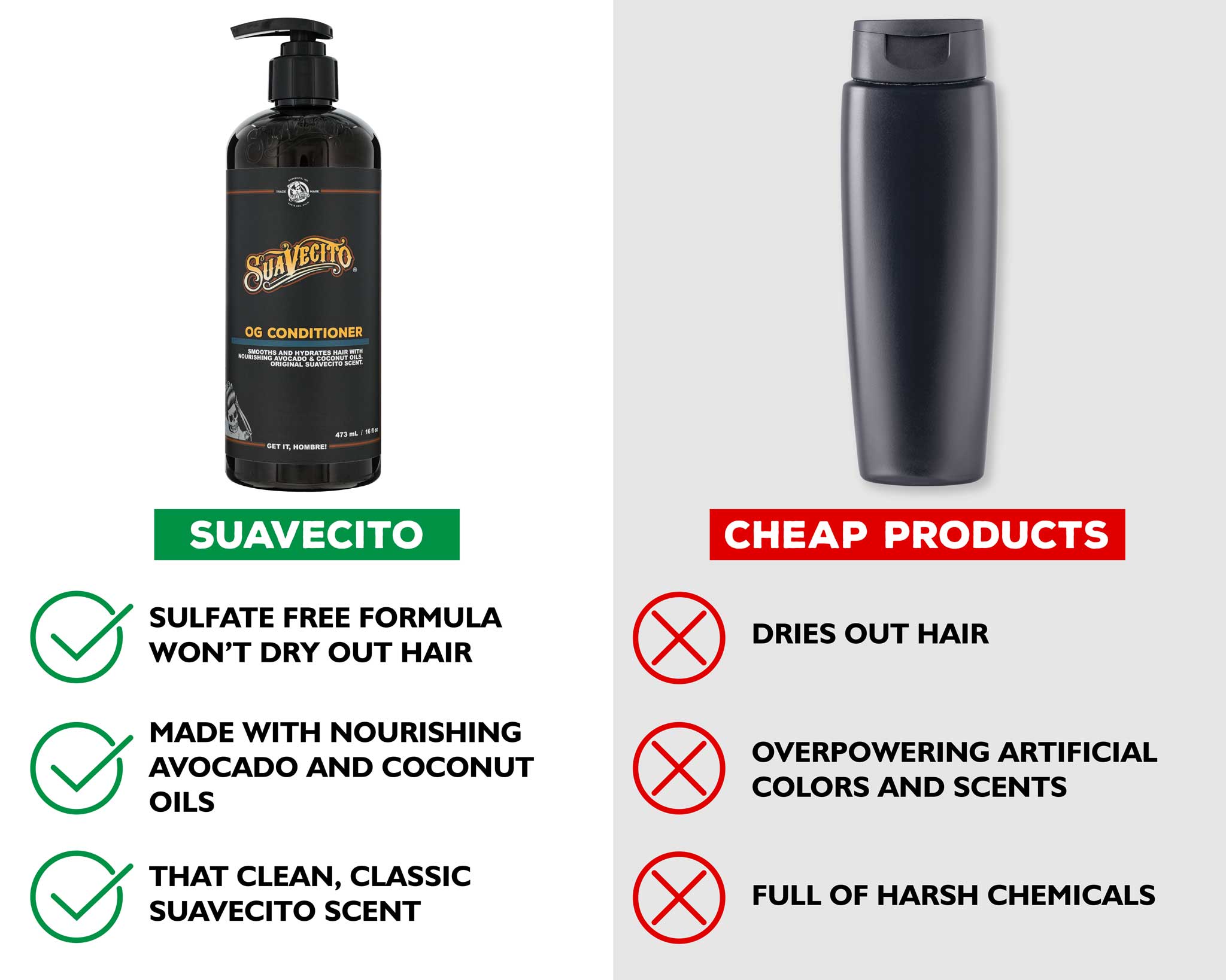 Suavecito OG Conditioner comparison graphic showing bottle and benefits—daily hydration, detangling, lightweight non-greasy, rinse-clean formula with signature barbershop scent.