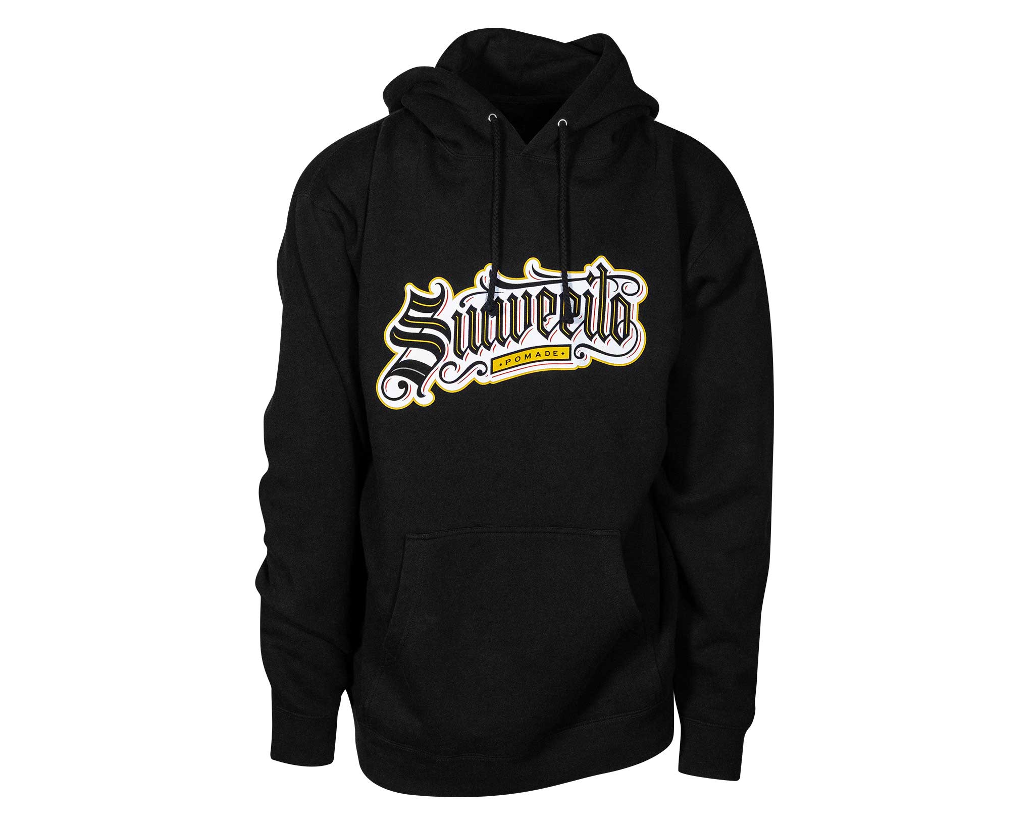 The Santo Roble Pullover Hoodie in classic black features the iconic "Suavecito Pomade" script across the chest and a Día de Muertos inspired design on the back.
