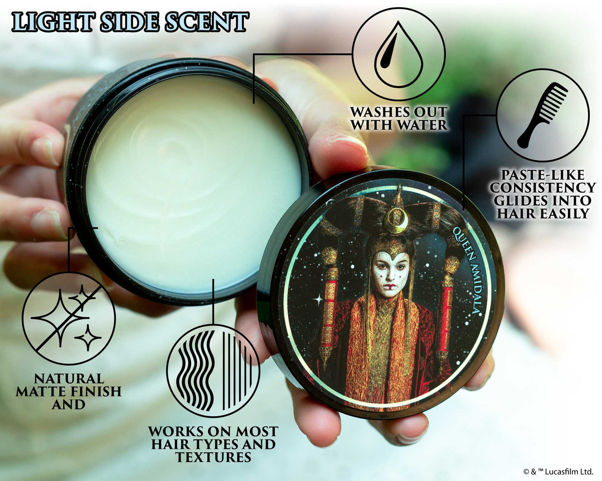 Queen Amidala Matte Pomade - You’ll be hair royalty with this special edition Queen Amidala™ inspired Matte Pomade. This pomade gives you a medium hold with a low-to-no-shine matte finish. Use this product when you want a messier, more textured, natural looking style. It glides easily into hair and washes out easily at the end of the day with just water.