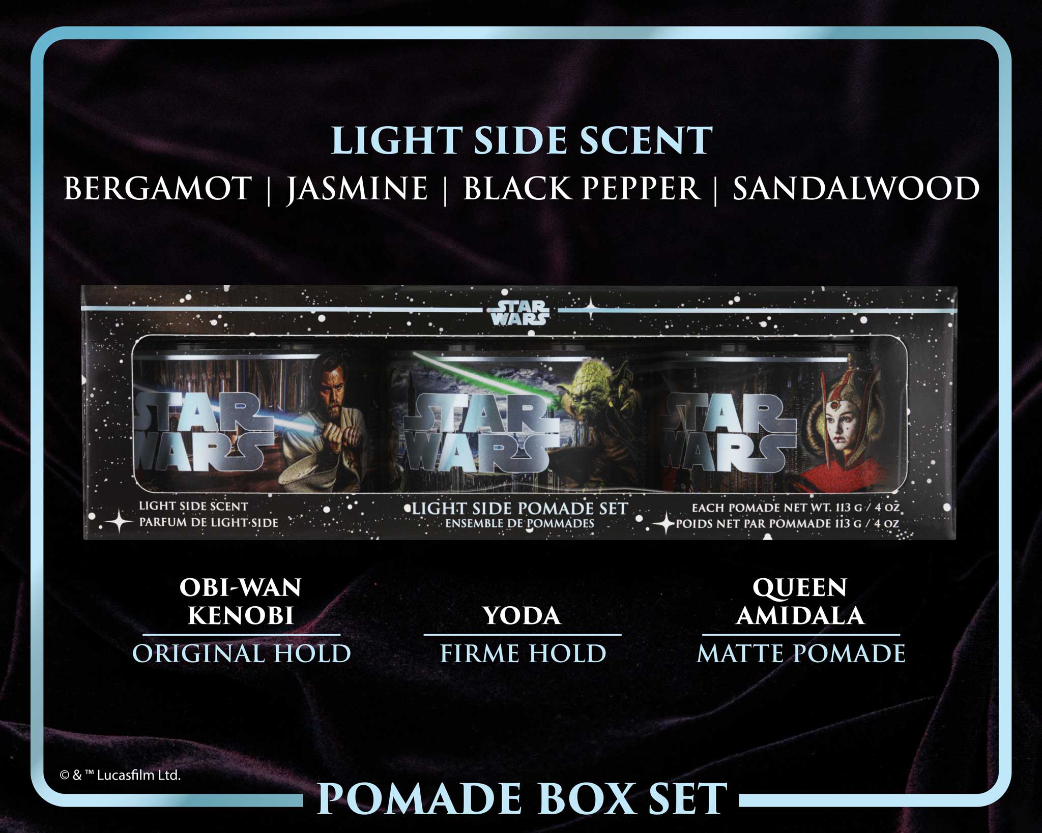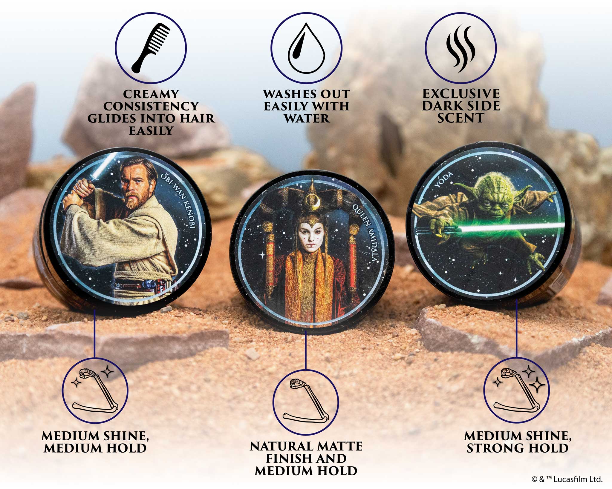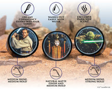 Obi-Wan Original Hold Pomade - Embark on a galactic adventure with the special edition Obi-Wan Kenobi™ inspired Original Hold Pomade. This Pomade glides easily into hair without tugging or pulling and contains no harsh chemicals, creating a clean, flake-free look. It’s water-soluble and washes out easily with just water. Medium hold, medium shine.