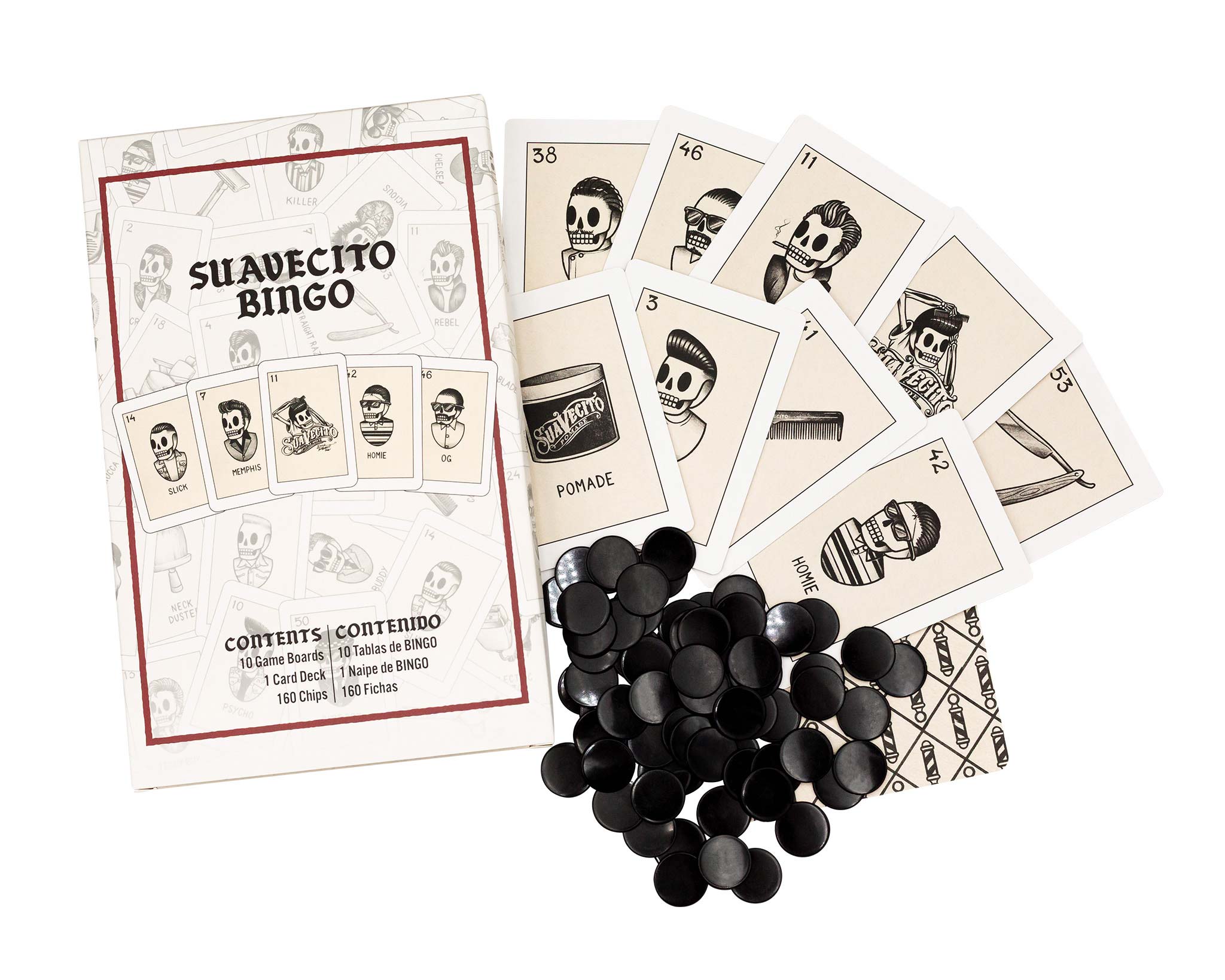 - Iconic hairstyles and traditional tools are highlighted in this Suavecito Bingo game. One person will call out the cards as the rest of the players mark their boards. The first player to get four in a row calls out “Suavecito!” to win.